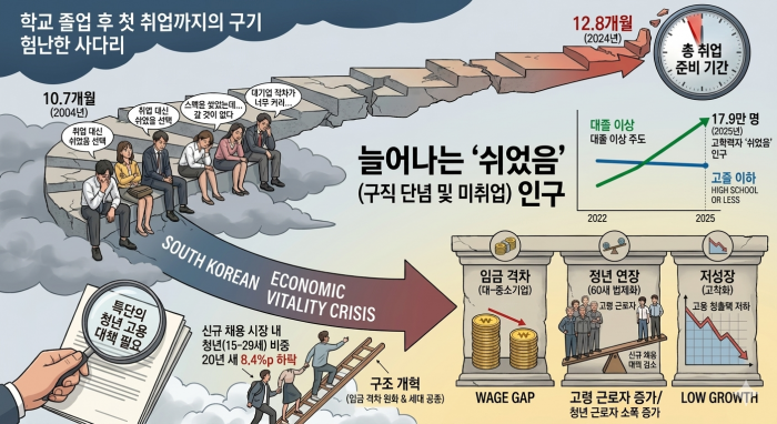 한국경영자총협회(경총)가 20일 발표한 '청년 일자리 창출을 위한 개선 과제' 보고서에 따르면, 2024년 기준 1995∼1999년생(당시 25∼29세) 중 '쉬었음' 인구는 총 21만 7000명으로 집계됐다. 이는 이전 세대와 비교했을 때 현격히 늘어난 수치다. 20년 전인 2004년 당시 1975∼1979년생의 '쉬었음' 인구(8만 4000명)와 비교하면 무려 2.6배에 달하는 규모다. 1980년대생과 1990년대 초반생 역시 각각 10만~16만 명 수준을 기록하며 증가 추세를 보여왔다. 연도별 추이를 살펴보면 청년층(15∼29세) 전체의 '쉬었음' 인구는 2023년부터 3년 연속 증가하고 있다. 이러한 흐름은 대졸 이상 고학력자가 주도하고 있다. 대졸 이상 '쉬었음' 청년은 2023년 15만 3000명에서 2025년 17만 9000명으로 꾸준히 늘어난 반면, 고졸 이하 계층은 같은 기간 큰 변동이 없었다. 사회 진출 시기도 점점 늦어지는 추세다. 1995∼1999년생이 학교 졸업 후 첫 취업까지 걸린 기간은 평균 12.77개월(2024년 기준)로, 1975~79년생의 10.71개월(2004년)보다 2개월 이상 길어졌다. 청년층 전체의 평균 소요 기간 역시 2021년 10.1개월에서 2025년 11.3개월로 늘어났으며, 특히 고졸 이하 계층은 16.5개월에 달해 학력 간 격차도 벌어지고 있다. 신규 채용 시장 내 청년들의 입지도 좁아지고 있다. 근속 1년 미만 신규 채용자 중 청년층 비중은 2006년 33.6%에서 2025년 25.2%로 20년 새 8.4%포인트 하락했다. 경총은 이러한 청년 고용 위기의 원인으로 대기업과 중소기업 간의 극심한 임금 격차(43%)로 인한 인력 수급 미스매치, 정년 60세 의무화에 따른 기업들의 신규 채용 여력 감소, 저성장 고착화 등을 꼽았다. 보고서는 정년 연장 이후 대기업 내 고령 근로자는 145.9% 증가한 반면 청년 근로자 증가는 35.5%에 그쳐 세대 간 일자리 쏠림이 나타나고 있다고 분석했다. 최문석 경총 청년ESG팀장은 "작년 20~30대 '쉬었음' 청년이 70만 명을 넘어서는 등 고용 위기가 지속되고 있다"며 "'쉬는 청년'을 노동 시장으로 유인하고 일할 기회를 제공하는 특단의 대책이 시급하다"고 강조했다. 아울러 "청년 고용에 부정적 영향을 미치는 법정 정년 연장 논의에 신중해야 한다"고 덧붙였다. 통계청 등은 이러한 현상이 일자리의 절대적 부족을 넘어, 워라밸(일과 삶의 균형)과 성장 가능성 등 '일자리의 질'을 중요시하는 인식 변화가 반영된 결과로 보고 있다. '쉬었음' 상태의 장기화는 재취업 가능성을 낮추고 노동시장과의 연결을 약화시키는 악순환을 초래할 수 있어, 교육과 기업 문화 전반의 변화가 함께 요구된다. |